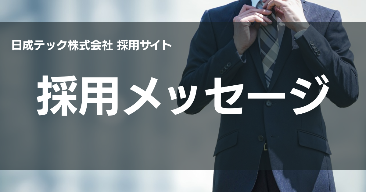採用メッセージ 2026.01.082026.01.25 私たちは、採用を「最初の一歩を共に始めること」と考えています。それぞれの歩みに寄り添いながら、その人の仕事がやがて社会につながっていくよう、かかわり続けること。それが、私たちにとっての採用です。一人ひとりの成長は、結果として会社を支え、社会につながっていきます。だからこそ、仕事を通じて少しずつできることを増やし、自分の役割を実感していく過程を、私たちは大切にしています。その最初の一歩に、私たちは丁寧に向き合い続けていきます。 日成テック株式会社 採用チーム一同